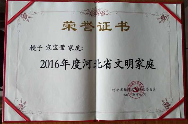 河北省衡水市冀州区有一个家庭,3口人,女主人寇宝莹,丈夫刘洪山和女儿刘浩琳(见图)。这个家庭,被授于“河北省文明家庭”( 见图)。
